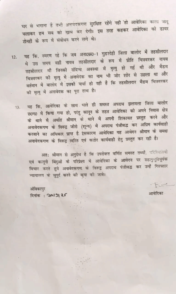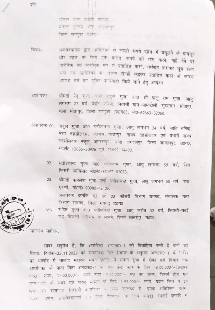 मिली जानकारी के मुताबिक, राहुल गुप्ता वर्तमान में जगदलपुर के फ्रेजरपुर में तहसीलदार पद पर पदस्थ हैं। वहीं तहसीलदार की पत्नी सरगुजा के सीतापुर की रहने वाली हैं। आरोप लगाते हुए रेनू ने कहा कि उनके पति शादी के बाद से ही उन्हें लगातार दहेज के लिए प्रताड़ित कर रहे है। शिकायत में कहा गया है कि राहुल गुप्ता और उनके पिता सतीशचंद गुप्ता सहित परिवार के अन्य सदस्यों ने शादी के बाद एक करोड़ रुपये दहेज की मांग की थी।