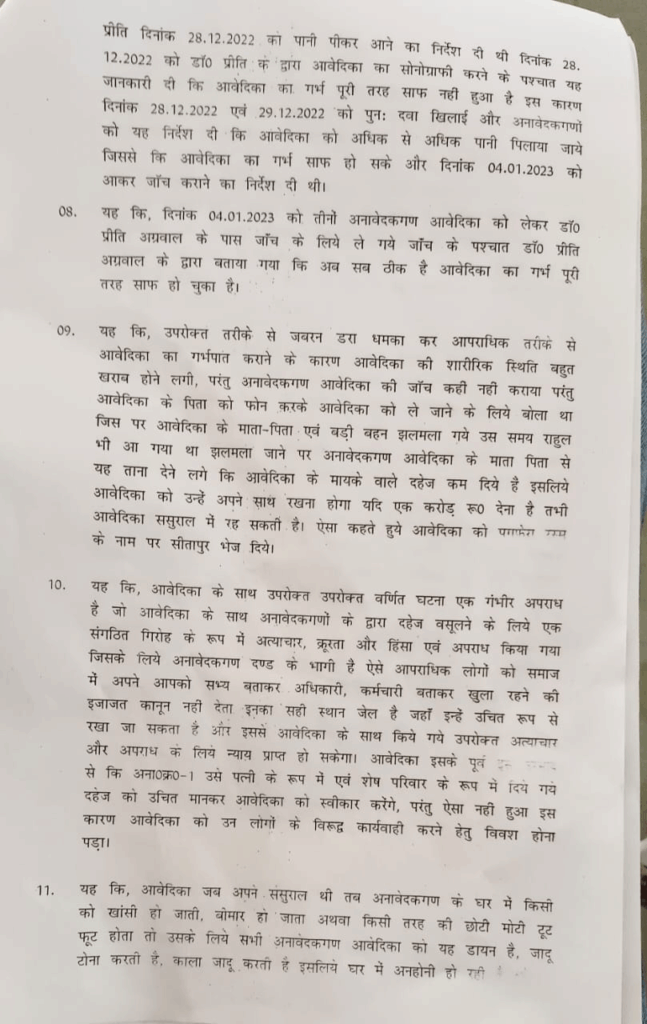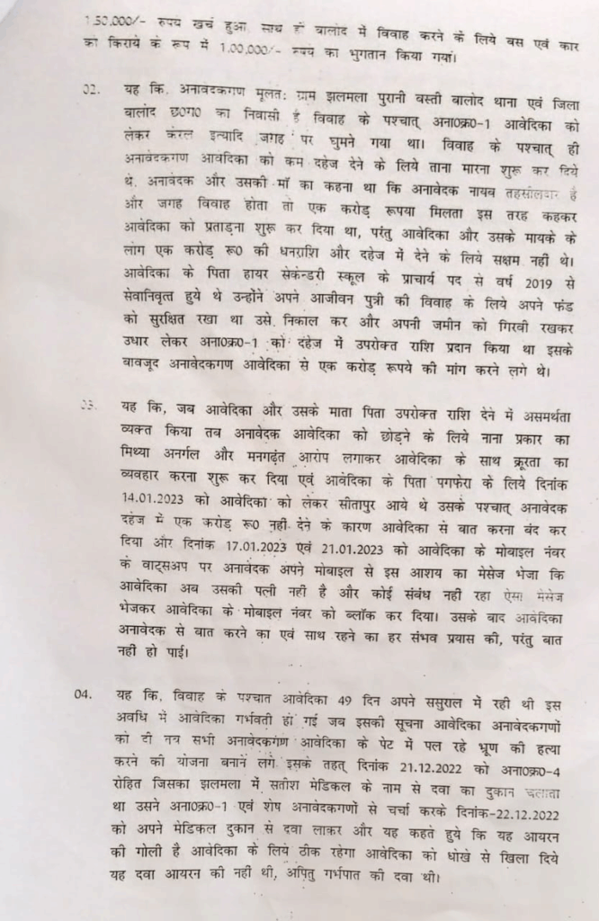रेनू के मुताबिक, उनके परिजनों ने पहले ही 50 लाख रुपये दहेज के रूप में दे दिए थे, लेकिन इसके बाद भी ससुराल पक्ष की मांगें खत्म नहीं हुईं। जब उन्होंने और उनके परिवार ने अतिरिक्त रकम देने से इंकार किया, तो उन्हें मानसिक और शारीरिक रूप से प्रताड़ित किया जाने लगा। यह भी आरोप लगाया कि पति और ससुराल पक्ष के दबाव में उनका जबरन गर्भपात करवाया गया। उन्होंने बताया कि इस पूरे घटनाक्रम के दौरान उन्हें लगातार धमकियां दी जाती रहीं और समाज में बदनाम करने की कोशिश की गई।
