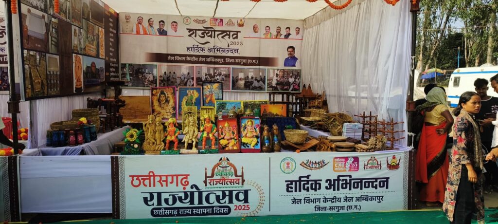 अंबिकापुर। शहर के कलाकेंद्र मैदान में आयोजित राज्योत्सव कार्यक्रम में विभिन्न विभागों द्वारा स्टॉल लगाए गए हैं। इनमें सेंट्रल जेल के कैदियों द्वारा बनाए गए बांस के सामानों व मूर्तियों की भारी डिमांड है। उद्घाटन के दिन मंत्री रामविचार नेताम ने सभी स्टॉलों का निरीक्षण किया, लेकिन सेंट्रल जेल (Central jail Ambikapur) के कैदियों द्वारा बनाए गए सामानों की उन्होंने जमकर सराहना की। इस दौरान जेल प्रबंधन द्वारा उन्हें राम मंदिर की पेंटिंग भेंट की गई।