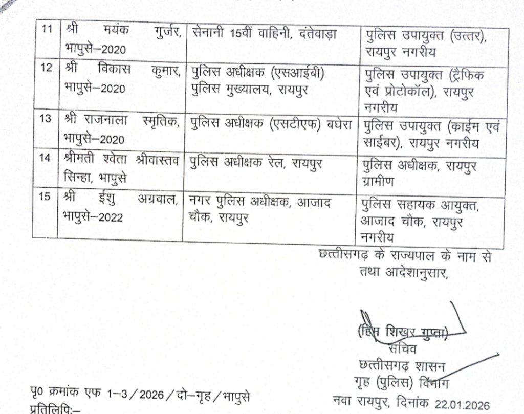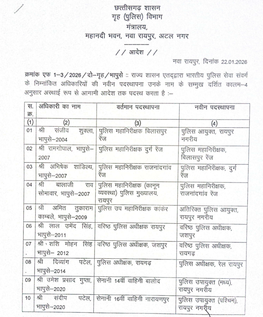 इसके अलावा अमित तुकाराम कांबले (IPS-2009) को कांकेर से अतिरिक्त पुलिस आयुक्त, रायपुर नगरीय तथा लाल उमेद सिंह (IPS-2011) को रायपुर से वरिष्ठ पुलिस अधीक्षक, जशपुर पदस्थ किया गया है।