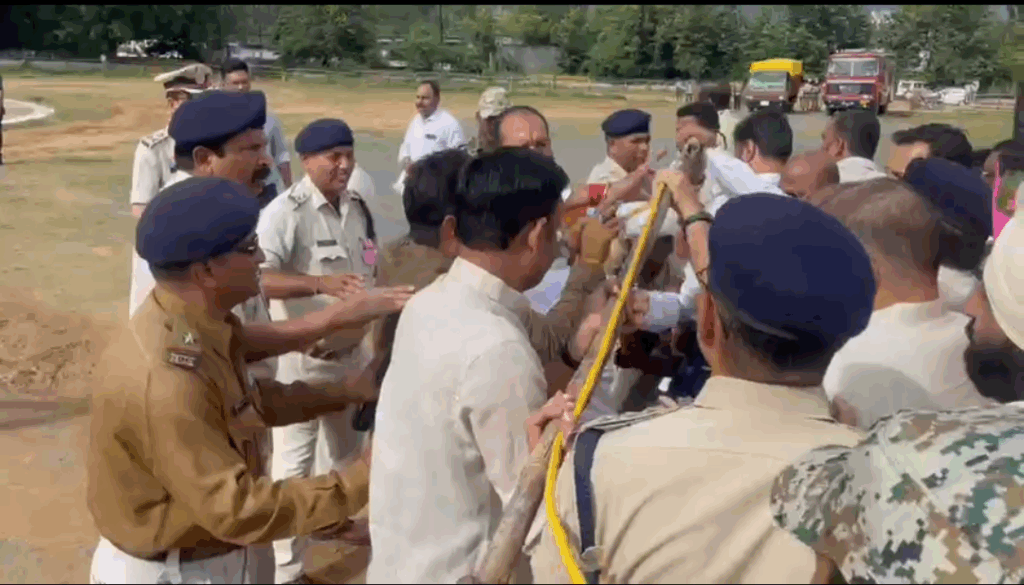 Dispute in BJP leaders and policemen: बाबा कार्तिक उरांव चौराहे का विकास एवं प्रतिमा स्थापना कार्य का भूमिपूजन करने अंबिकापुर पहुंचे सीएम विष्णु देव साय, पीजी कॉलेज मैदान स्थित हेलीपैड पर स्वागत करने पहुंचे थे कार्यकर्ता
